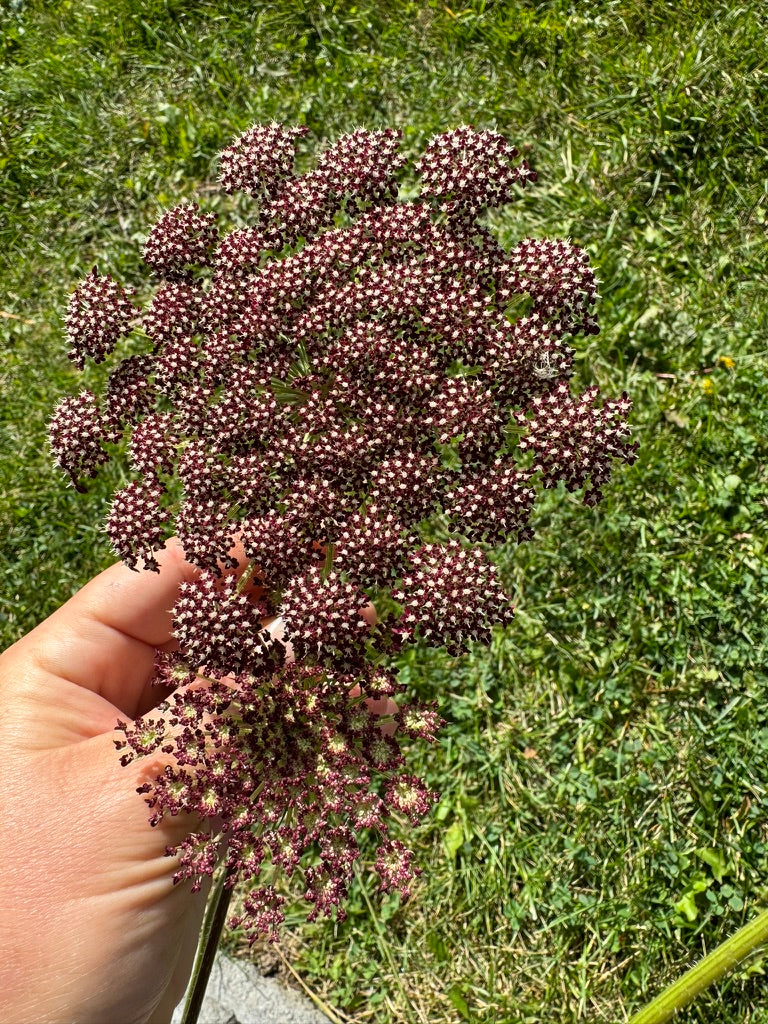 Daucus carota. A stunning ornamental variety with wide 6" lacy umbels in rich shades of burgundy. Long, slender stems make it an excellent cut flower, adding airy texture to bouquets. Attracts all types of pollinators. Blooms mid to late summer.