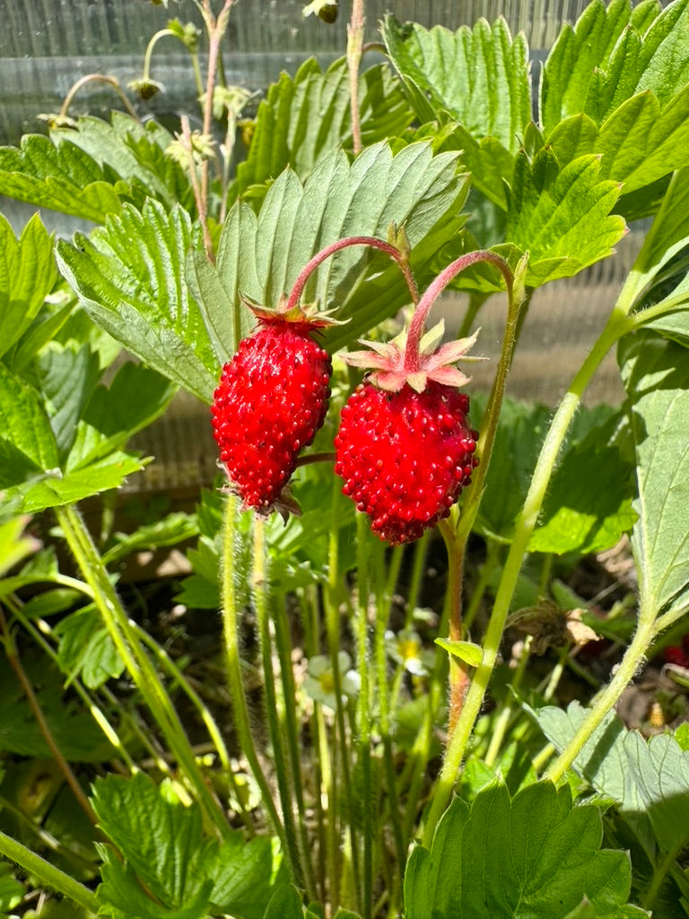 Fragaria vesca. Everbearing alpine strawberry from Finland, producing small, intensely sweet, sugary-flavoured red fruits. Compact plants are ideal for borders, containers, and garden beds, with continuous harvests through the season once established.