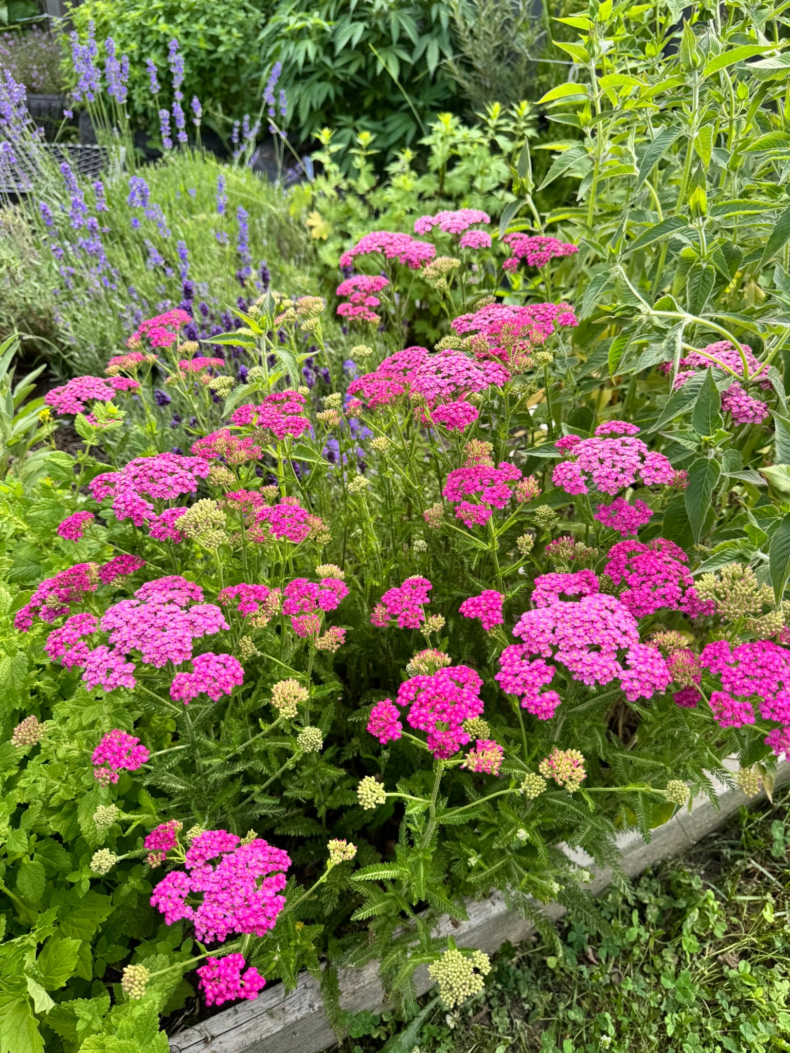 Achillea millefolium. A medicinal herb with a variety of health benefits (digestion, immunity, headaches, anxiety, inflammation, toothaches). Tight flower clusters atop hairy, lacy, fern-like leaves. Blooms late into October. An excellent pollinator plant. Easy to grow from seed. Frost and drought resistant.